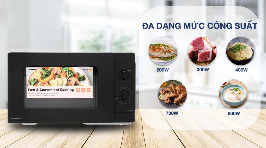 - Với công suất vi sóng tối đa 900W, được chia làm 5 mức, lò vi sóng Panasonic này giúp nấu, hâm nóng, rã đông nhanh chóng.