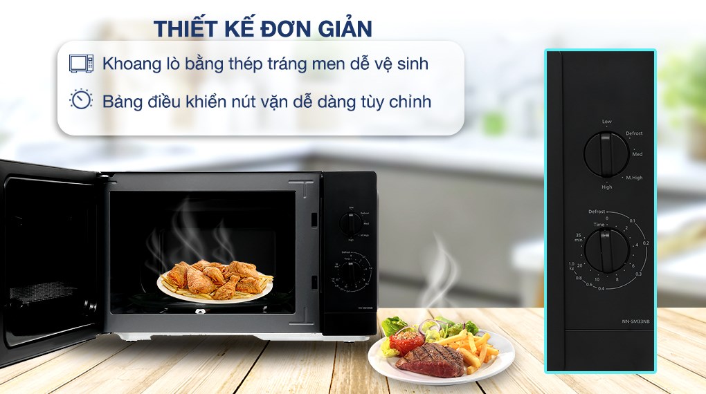 Lò vi sóng Panasonic NN-SM33NBYUE 25 lít có công suất vi sóng 900W, bảng điều khiển nút vặn, thiết kế đơn giản, có nút nhấn mở cửa lò tiện lợi, được trang bị chuông báo khi nấu xong, giúp nấu, hâm nóng, rã đông thực phẩm tiện lợi.