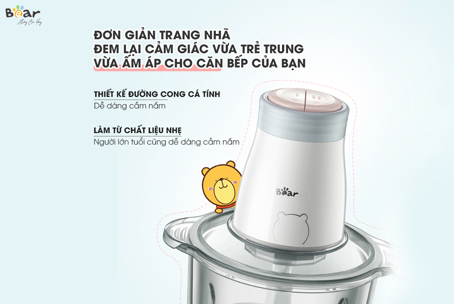 Với thiết kế thông minh, nhỏ gọn, máy xay thịt đa năng Bear 2L sẽ không làm tốn diện tích căn bếp của bạn hay tạo cho bạn cảm giác cồng kềnh. Phần cốc xay của máy có dung tích 2L, được thiết kế có quai cầm, giúp bạn dễ dàng cầm máy một cách chắc chắn và tiện lợi khi vệ sinh máy. Bên cạnh đó, phần cối xay tích hợp các nút chức năng máy được làm từ chất liệu nhẹ, đem lại giải pháp "không tốn sức" cho những người lớn tuổi khi vào bếp. Đây cũng là ưu điểm mạnh của máy xay thịt đa năng Bear so với những dòng máy xay thịt khác trên thị trường hiện nay.