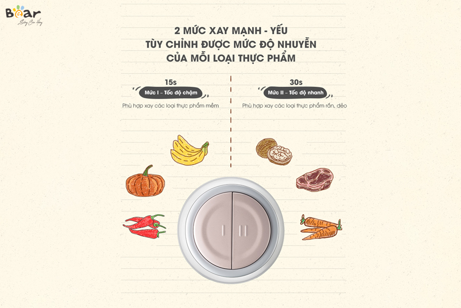 - Với mức xay thứ nhất (biểu tượng I), máy xay thịt đa năng Bear sẽ xay tốt các loại thực phẩm mềm ở tốc độ chậm là 15 giây.