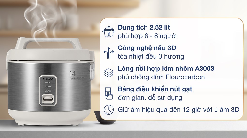 Cuckoo CR-1415 được trang bị chức năng giữ ấm 3D, giúp cơm luôn nóng hổi và mềm ngon trong 12 giờ. Tính năng này rất hữu ích cho gia đình bận rộn hoặc khi bạn muốn chuẩn bị bữa ăn sẵn sàng đúng thời điểm mà không lo cơm bị nguội hay khô.