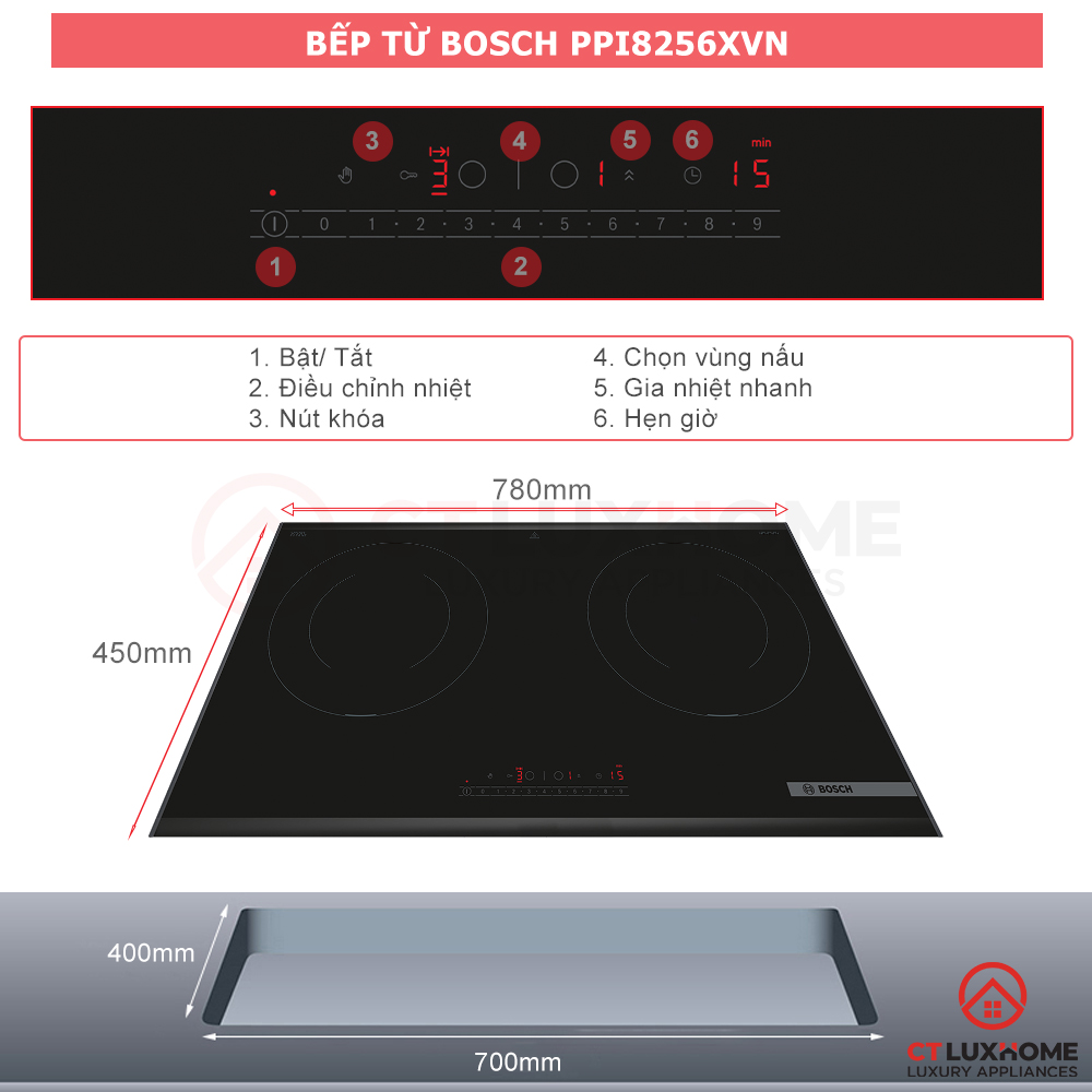 - Bosch PPI8256XVN với tổng công suất 3500W có thể phục vụ nấu ăn cho gia đình từ 2-4 người.
