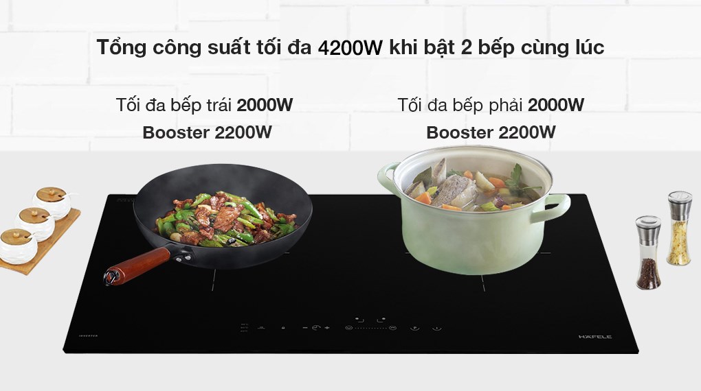 Bếp từ có tổng công suất 4200W, mỗi vùng nấu tối đa 2000W và đạt 2200W khi sử dụng Booster gia nhiệt nhanh