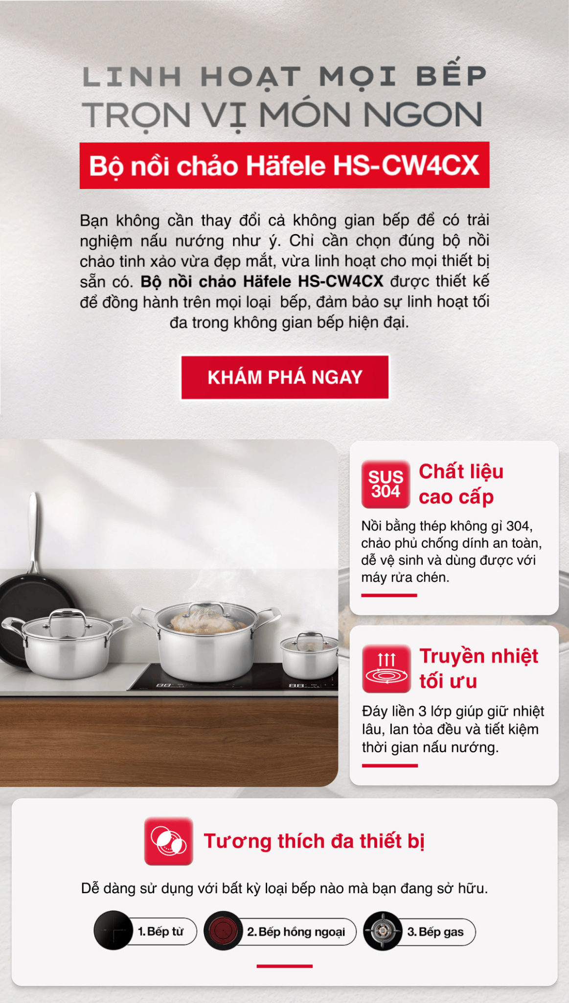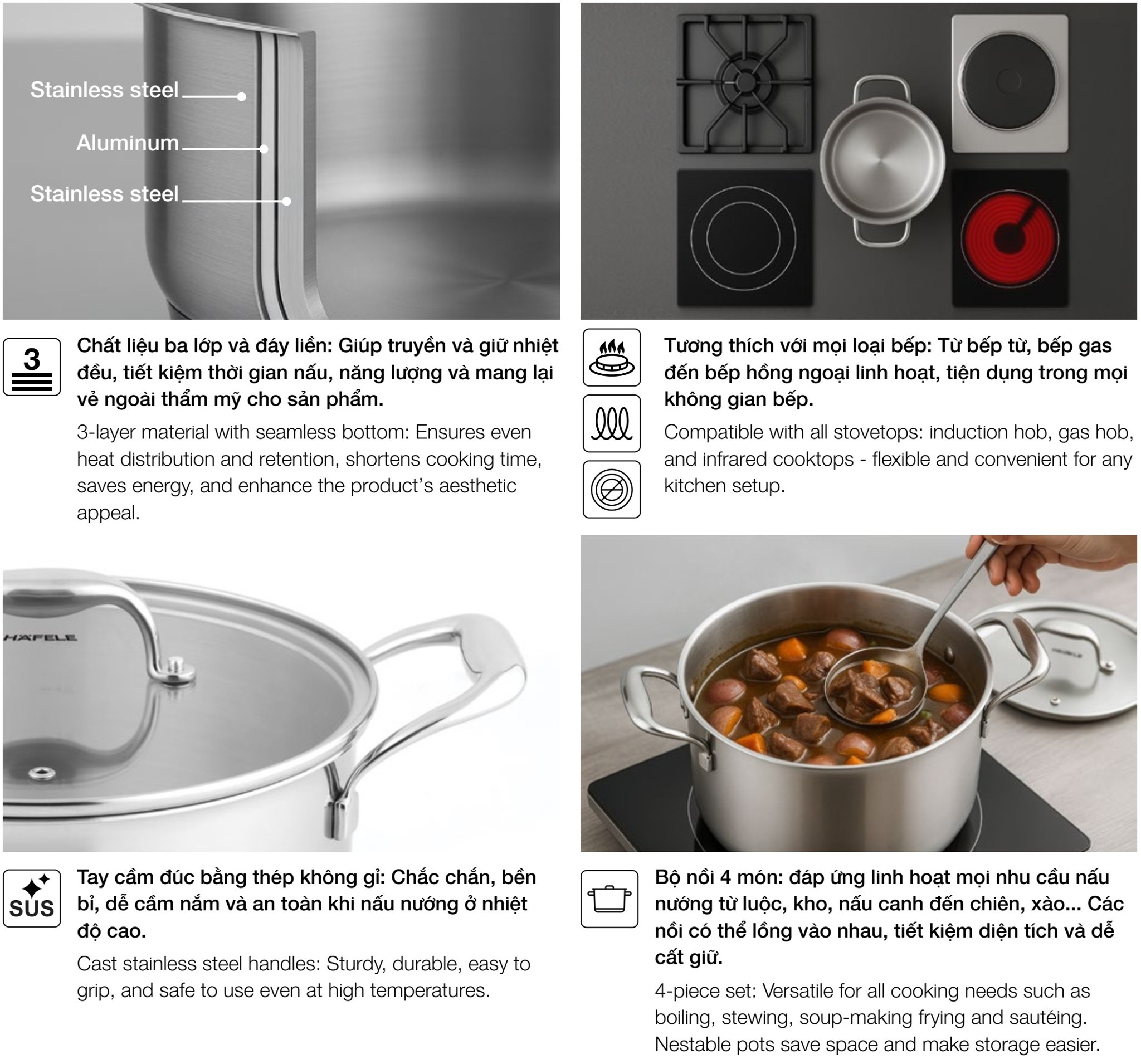 • Phù hợp với mọi loại bếp: bếp từ, bếp gas, bếp hồng ngoại, v.v.