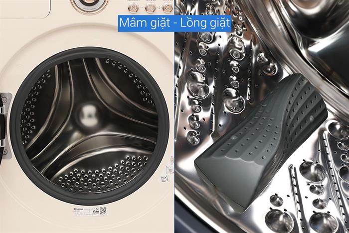 - Máy giặt Hisense có kiểu dáng cửa trước – lồng ngang hiện đại, nổi bật với gam màu trắng be tinh tế, dễ dàng kết hợp với các không gian nội thất từ cổ điển đến tối giản.