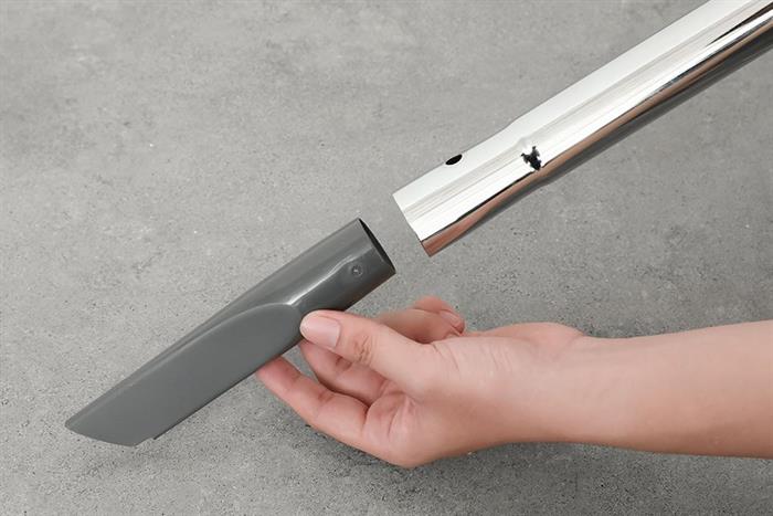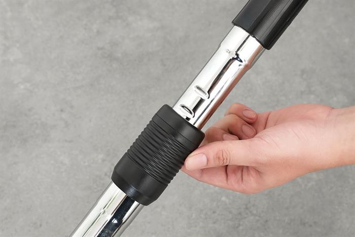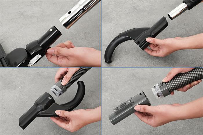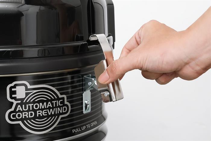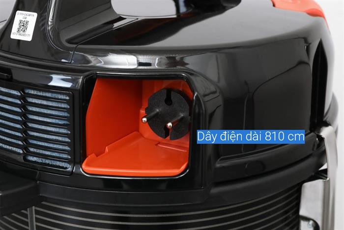 - Tay cầm gập đôi phía trên giúp nâng nhấc thuận tiện. Dây điện dài 8.1m được tích hợp cơ chế thu dây tự động, hỗ trợ cất gọn nhanh chóng chỉ bằng một thao tác bấm. Ống nối dài bằng kim loại chắc chắn và có thể điều chỉnh độ dài giúp tiếp cận các vị trí cao hoặc dưới gầm bàn ghế một cách linh hoạt.