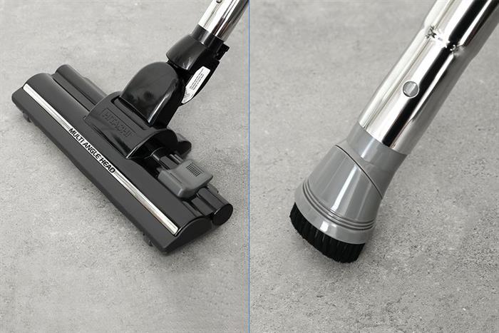 Máy hút bụi công nghiệp đi kèm nhiều đầu hút chuyên dụng, bao gồm đầu hút sàn/thảm xoay linh hoạt, đầu hút khe và đầu hút bàn chải. Những đầu hút này cho phép người dùng linh hoạt xử lý nhiều bề mặt khác nhau như sàn cứng, thảm, ghế sofa, rèm cửa hay ngóc ngách gầm giường, đảm bảo hiệu quả làm sạch toàn diện cho mọi khu vực.