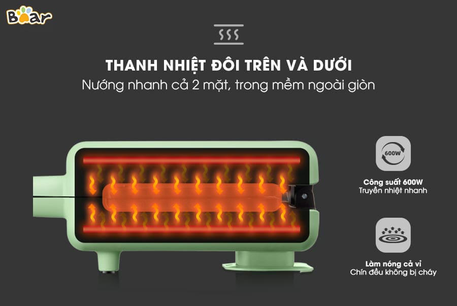 Với cơ chế truyền nhiệt nhanh, máy nướng bánh mì kẹp Bear có thể cho ra thành phẩm bánh kẹp, bánh waffle chỉ trong ít phút. Đặc biệt, trên thân máy có đèn báo hiệu. Nếu máy hiển thị đèn sáng, tức là máy đang trong trạng thái có điện; máy hiển thị đèn tắt, tức là máy đang trong trạng thái ngắt điện. Bên cạnh đó, máy có chế độ tự động ngắt điện khi quá nóng, do đó, bạn có thể hoàn toàn yên tâm sử dụng.