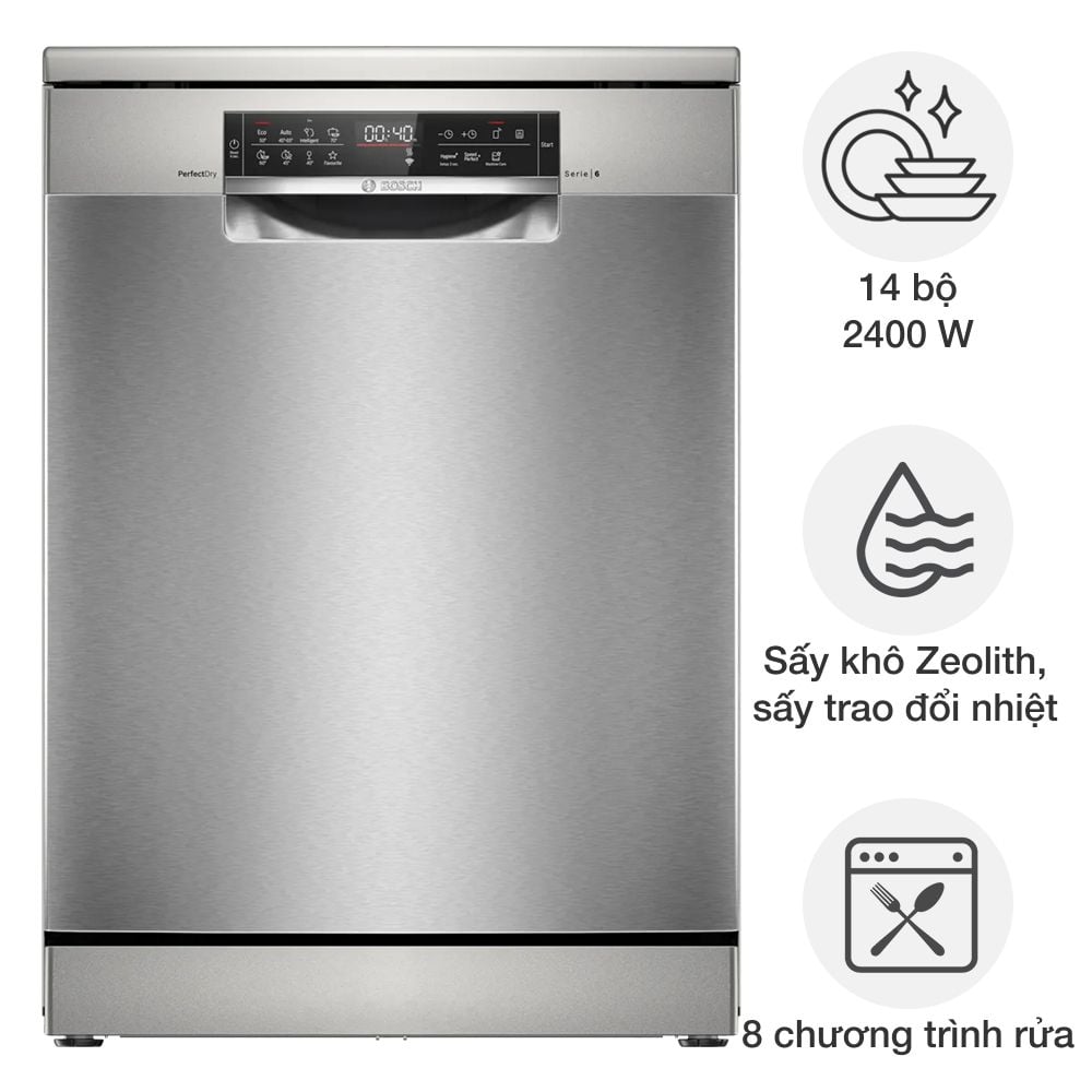 Bosch SMS6ZCI02P có sức chứa lên đến 14 bộ bát đĩa tiêu chuẩn Châu Âu, tương đương 2–3 bữa ăn của gia đình Việt từ 4–6 người. Cấu trúc giỏ thông minh MaxFlex và ngăn kéo VarioDrawer giúp: