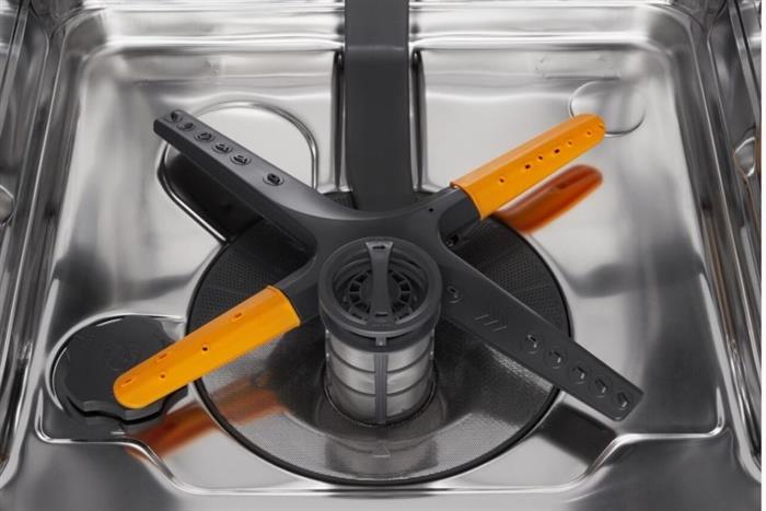 Khoang rửa được bố trí nhiều khu vực xếp đồ, trong đó khay trên có thể thay đổi chiều cao, giúp linh hoạt hơn khi muốn xếp ly cao, chén bát kích thước vừa hoặc các hộp nhựa. Việc tùy chỉnh độ cao khay trên giúp hạn chế va chạm giữa vật dụng và cánh phun nước, đồng thời tận dụng tốt hơn thể tích khoang rửa khi cần rửa nồi thấp hoặc tô lớn.