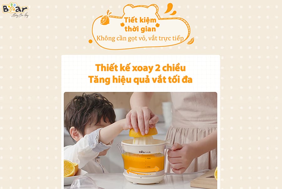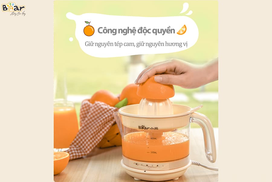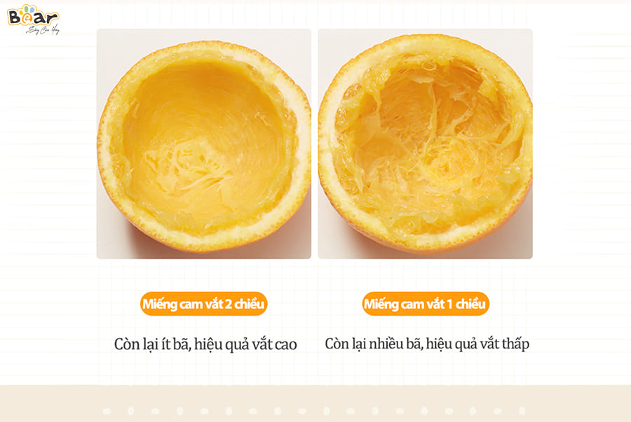 Khác với các dòng máy vắt cam truyền thống trên thị trường, máy vắt cam Bear sử dụng động cơ để tạo ra dòng xoáy vắt cam tự động riêng biệt giúp tăng hiệu quả vắt. Máy tính hợp công nghệ vắt 2 chiều giúp vắt cam kiệt nước hơn và còn lại ít bã ơn phương pháp vắt tay truyền thống hoặc vắt một chiều như thông thường.