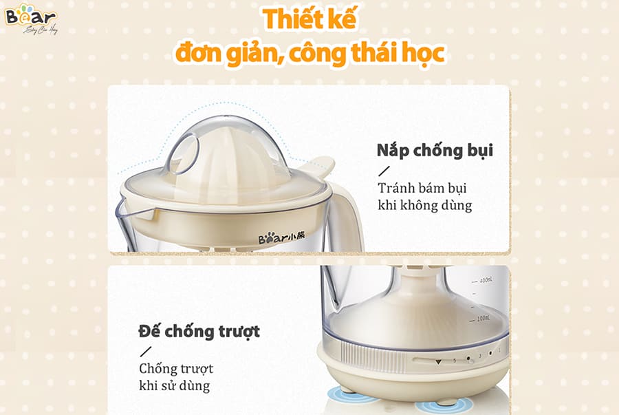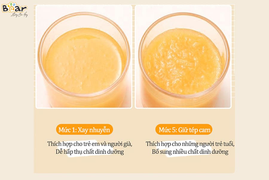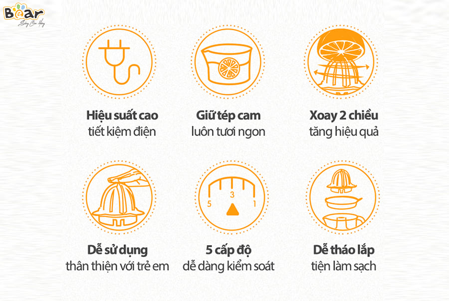 Đặc biệt, để phù hợp với nhu cầu của người dùng Bear tích hợp đến 5 chế độ vắt khác nhau, giúp bạn chọn lựa vắt cam từ vắt kiệt lấy mỗi nước, đến giữ nguyên những tép cam căng mọng vô cùng tiện lợi. Nhờ phương pháp này mà bạn có thể tận dụng được tối đa dinh dưỡng từ ly nước cam mình sử dụng mỗi ngày nhé, tránh lãng phí.