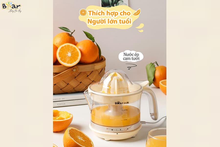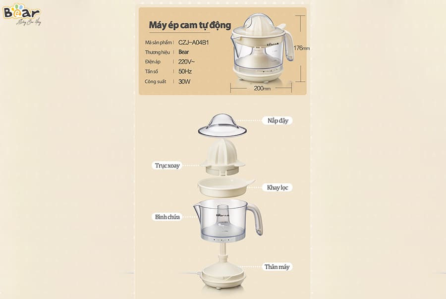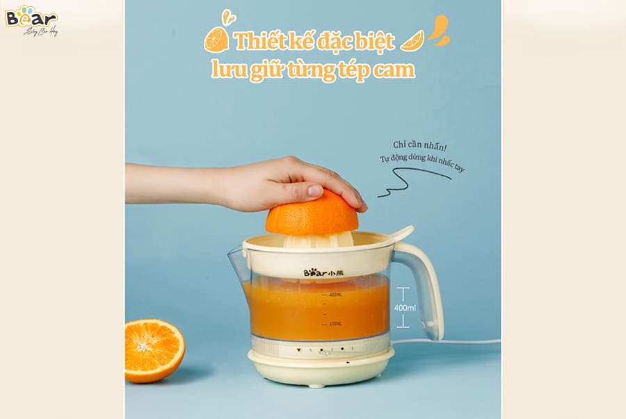 Máy vắt cam Bear CZJ-A04B1 với thiết kế thông minh, nhỏ gọn và tính năng vắt cam tự động tiện lợi giúp bạn làm nước cam nhanh chóng và không tốn sức như phương pháp truyền thống.