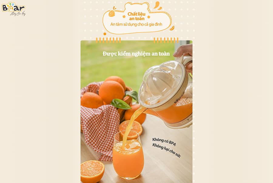 Toàn bộ thân máy vắt cam Bear được làm từ nhựa thực phẩm vô cùng an toàn, đảm bảo không chứa chất độc hại BPA gây ảnh hưởng đến sức khỏe người dùng.