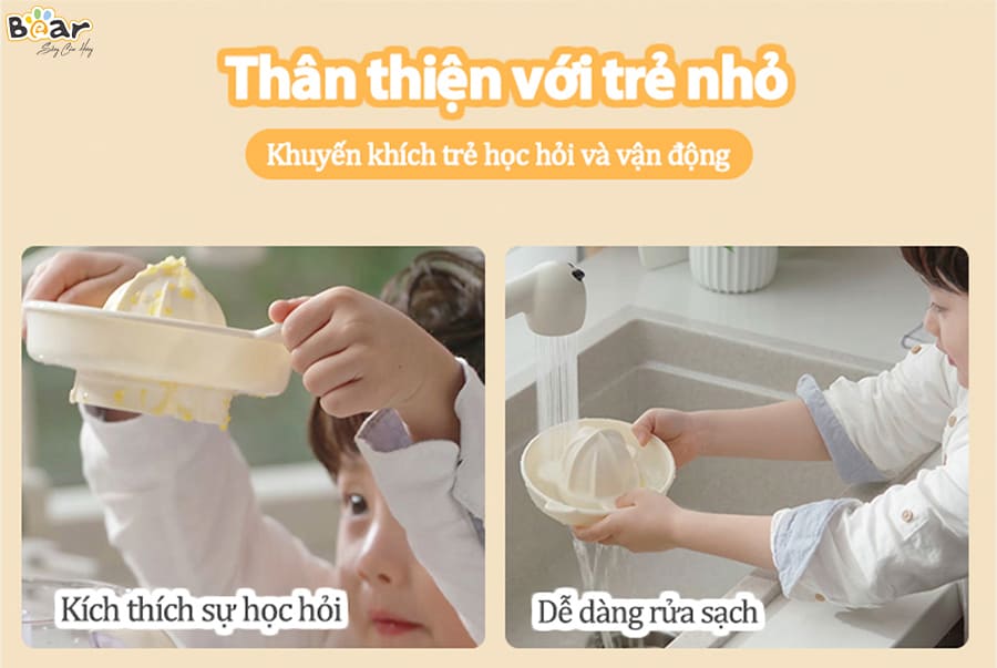 Máy sở hữu cấu tạo đơn giản, thiết kế thông minh đảm bảo không rò rỉ điện nên bạn có thể hoàn toàn cho bé yêu thực hành vắt cam mỗi ngày, giúp bé mở mang kiến thức và tự chăm sóc mình tốt hơn.