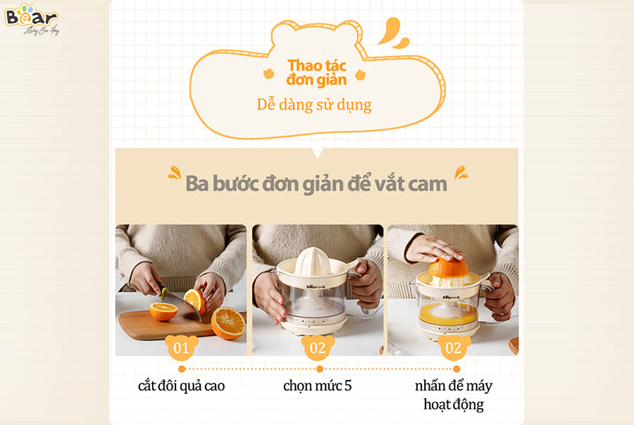 Máy được thiết kế dạng xoáy tự động vô cùng tiện lợi, từ người già đến trẻ nhỏ (trên 8 tuối) đều có thể dễ dàng sử dụng máy vắt cam Bear với thao tác như sau: