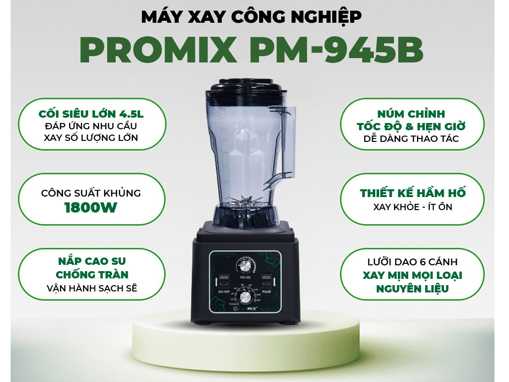 Promix PM-945B với công suất 1.800W, cối xay có dung tích 4.5 lít và động cơ siêu mạnh mẽ, mang đến khả năng xay thực phẩm hiệu quả, giúp bạn tiết kiệm thời gian và công sức. Máy thích hợp cho cả sử dụng gia đình và công việc kinh doanh, đảm bảo chất lượng thực phẩm luôn đạt chuẩn.