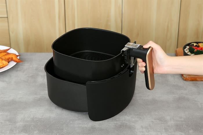 - Nồi chiên không dầu có thiết kế độc đáo, hiện đại với màu đen viền vàng đồng sang trọng, phù hợp với nhiều không gian nội thất khác nhau.