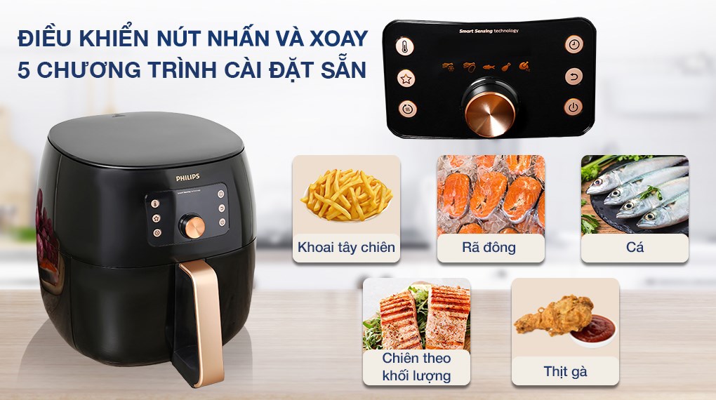 Sở hữu 5 chương trình nấu cài đặt sẵn gồm: rã đông, khoai tây chiên, cá, thịt gà, chiên nướng theo lượng kg vô cùng tiện lợi
