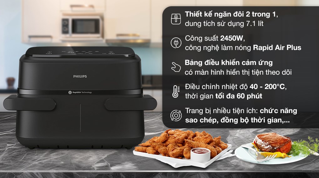 Với thiết kế 2 trong 1 độc đáo, nồi chiên không dầu Philips NA150/00 7.1 lít không chỉ đáp ứng nhiều nhu cầu nấu nướng khác nhau, mà còn tối ưu không gian và thời gian chế biến. Kết hợp công nghệ Rapid Air Plus hiện đại, 6 chương trình cài sẵn tiện lợi cùng các chức năng thông minh như sao chép và đồng bộ thời gian, sản phẩm là lựa chọn lý tưởng cho những người bận rộn, không có nhiều thời gian và muốn nâng tầm trải nghiệm nấu nướng tại gia.