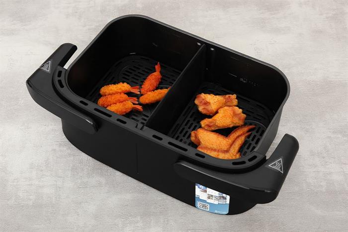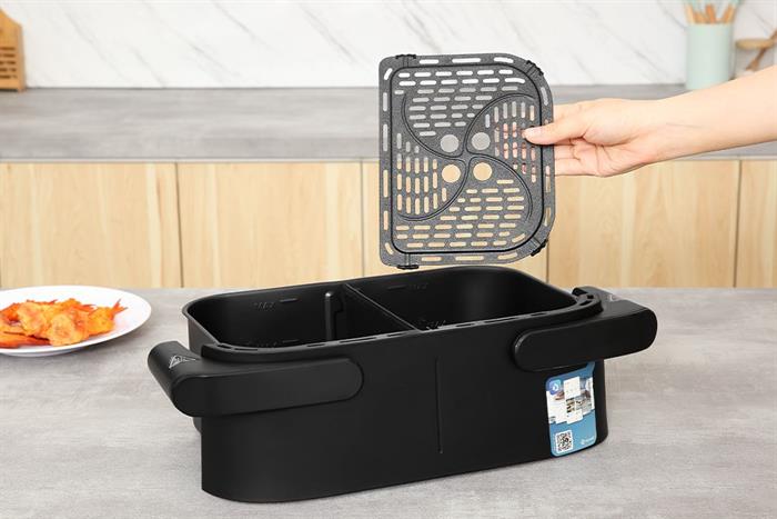 Bạn có thể dùng một ngăn khi chỉ cần nấu khẩu phần nhỏ, hoặc tận dụng cả hai ngăn để chế biến hai món khác nhau cùng lúc, vừa tiết kiệm thời gian, vừa không lo món này ám mùi món kia. Khi tháo vách ngăn, khay chiên trở nên rộng rãi với dung tích 7.1 lít, đủ sức chiên gà nguyên con 1.5 kg hoặc 9 chiếc cánh gà, phục vụ bữa cơm hằng ngày hoặc những bữa tiệc ấm cúng của gia đình. Thao tác tháo lắp thanh chia ngăn rất đơn giản, thuận tiện vệ sinh sau khi sử dụng.